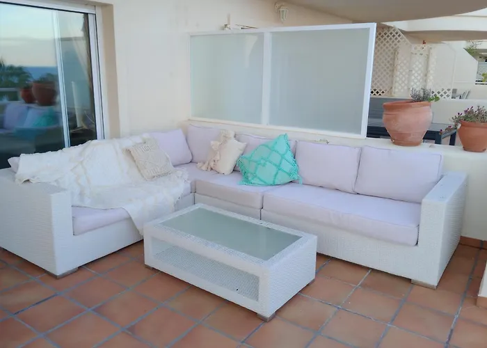 에스테포나에 있는 해변 Vistas Al Mar Panoramicas En Estepona 아파트는 도나 줄리아 골프 클럽에서 도보로 25분 거리에 있습니다. 기타 편의 시설에는 세탁기, 유리 제품, 주방용품이 마련된 부엌이 있습니다.